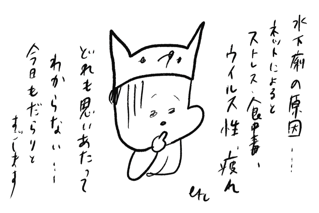 幸い痛みや気分の悪さはなく、ただただ一晩中新生児を授乳するくらいの頻度でトイレに駆け込むという。最近季節的にも不調続きだけど、お腹を下すのは久しぶり。