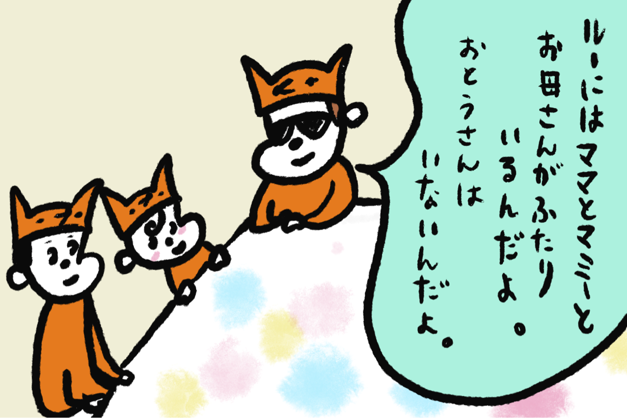 いつか、娘に「お父さん」について聞かれたら堂々と言うんだ!と思っていたけれど、いざ寝る前に「ルーのお父さんは?」と聞かれると何をどこまでいうのが正解なのかわからず、パートナーのマミルーを呼びました。(呑気にテレビをリビングで見てる場合じゃないぜ!)