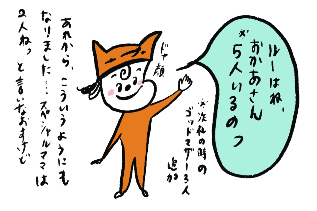 そして、マミルーは娘にも理解できるように、私たちの周りにいる、娘も知っているいろいろな家族の話も加えました。